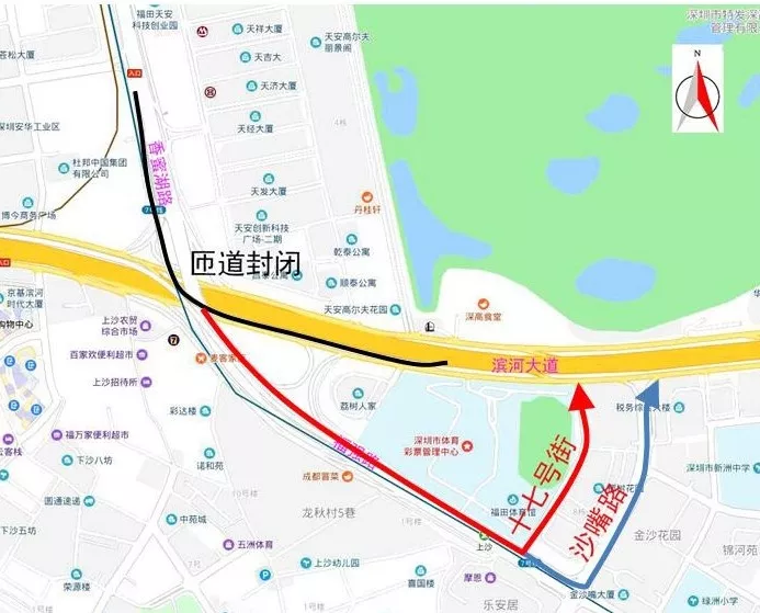 片區(qū)繞行:原經(jīng)香蜜湖路輔道往濱河大道東行的車輛,可沿香蜜湖路繼續(xù)前行至十七號街和沙嘴路左轉(zhuǎn)進(jìn)入濱河大道。