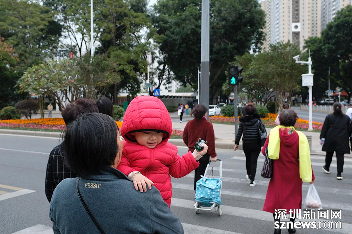 2018年12月12日,福田新洲,氣溫降至13度,寶寶穿上了羽絨服外出。
