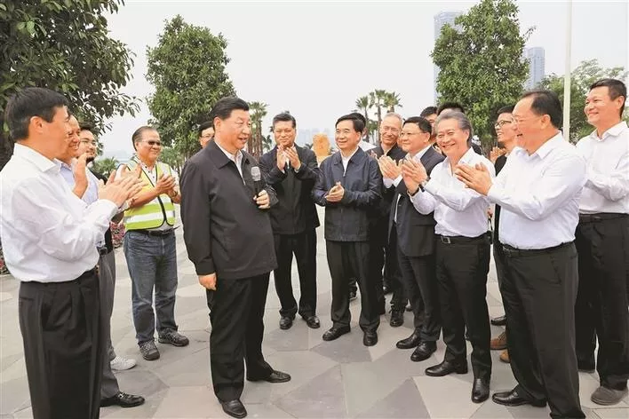 10月24日,習(xí)近平在廣東自由貿(mào)易試驗(yàn)區(qū)深圳前海蛇口片區(qū)考察。在前海石前,習(xí)近平同前海建設(shè)者和見證者代表同話滄桑巨變。新華社記者鞠鵬攝