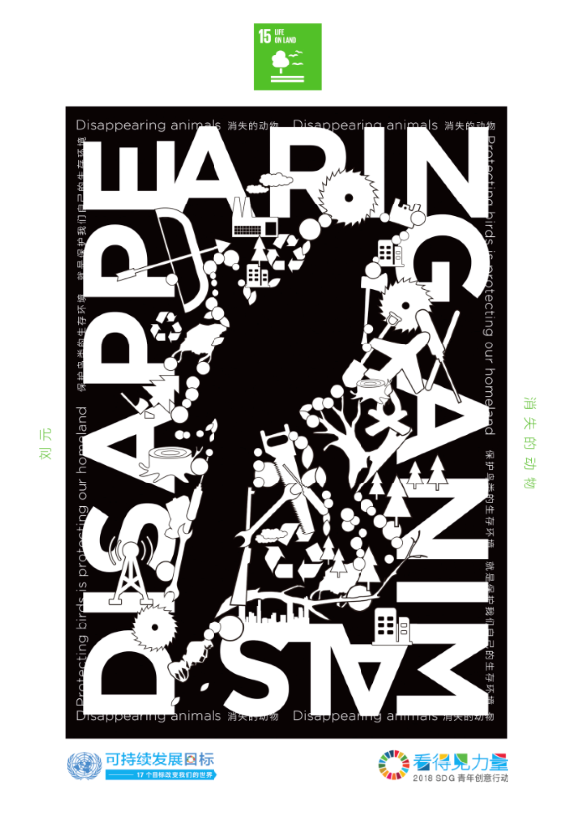 作品解釋 /隨著工業(yè)社會(huì)的飛速發(fā)展,我們面對(duì)的環(huán)境問(wèn)題越來(lái)越嚴(yán)重,特別是人類的伙伴-動(dòng)物更是面臨著各種環(huán)境問(wèn)題在不斷減少,作品以Disappearing animals為主題結(jié)合水、陸、空三種類型動(dòng)物為代表,以生活垃圾、破壞及殺害動(dòng)物等各種因素為設(shè)計(jì)元素,巧妙結(jié)合為正負(fù)圖形概念來(lái)傳達(dá)海報(bào)主題,黑白視覺(jué)、傳達(dá)危機(jī)。
