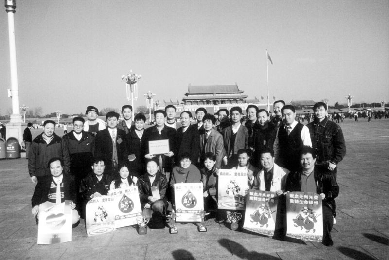 1999年,27位深圳市民獲得全國(guó)首批無(wú)償獻(xiàn)血金質(zhì)獎(jiǎng)杯后在天安門前合影。余海蓉?cái)z
