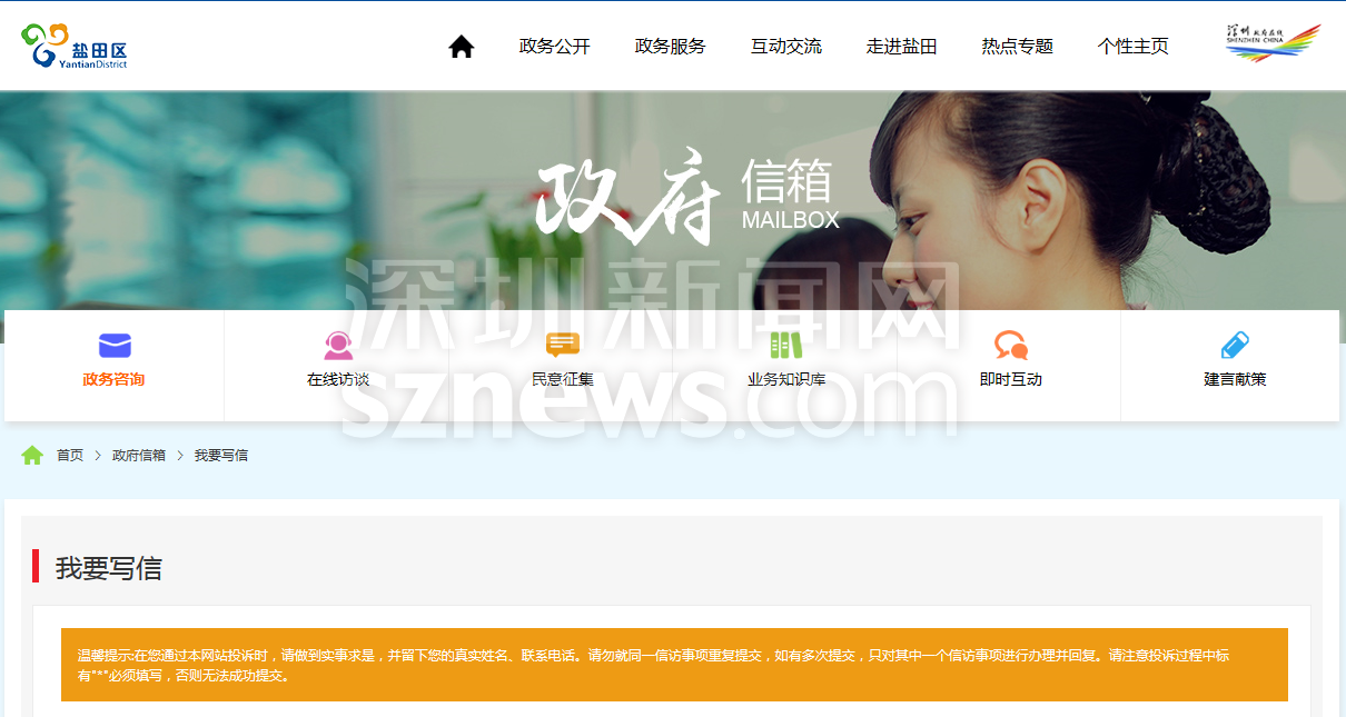 記者通過鹽田政府在線網(wǎng)站的信訪渠道寫信反饋情況,顯示提交成功