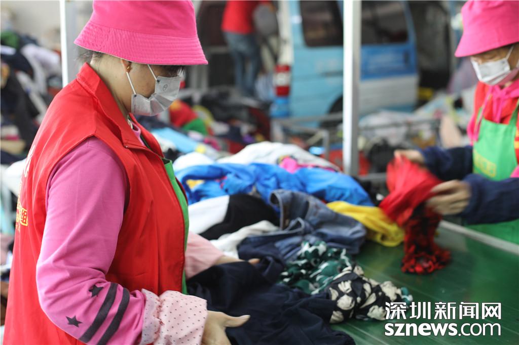 有人高的“衣山”,工作人員進(jìn)行初步篩選