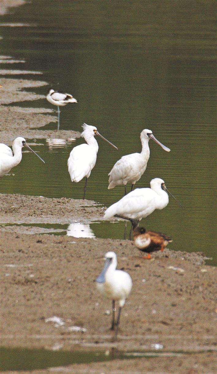 中午12時(shí)許,福田紅樹林國家級保護(hù)區(qū)的2號魚塘里,已經(jīng)聚集了45只珍稀候鳥——黑臉琵鷺。在它們身邊,還有數(shù)百只反嘴鷸、針尾鴨、綠翅鴨、琵嘴鴨、赤頸鴨、青腳鷸等候鳥在水中忙著覓食。