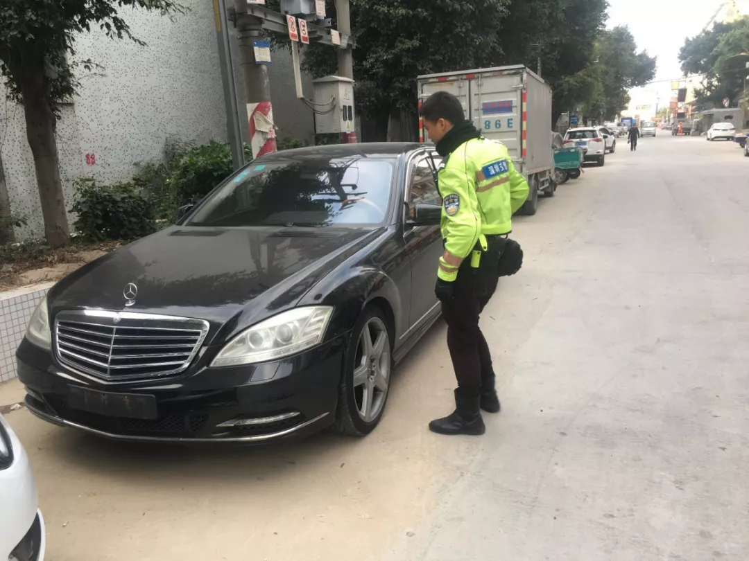 2018年12月28日下午17時(shí)左右,深圳交警鐵騎隊(duì)員巡邏至寶安沙井洋下大道附近的修理廠時(shí),發(fā)現(xiàn)一輛黑色奔馳未懸掛號(hào)牌。