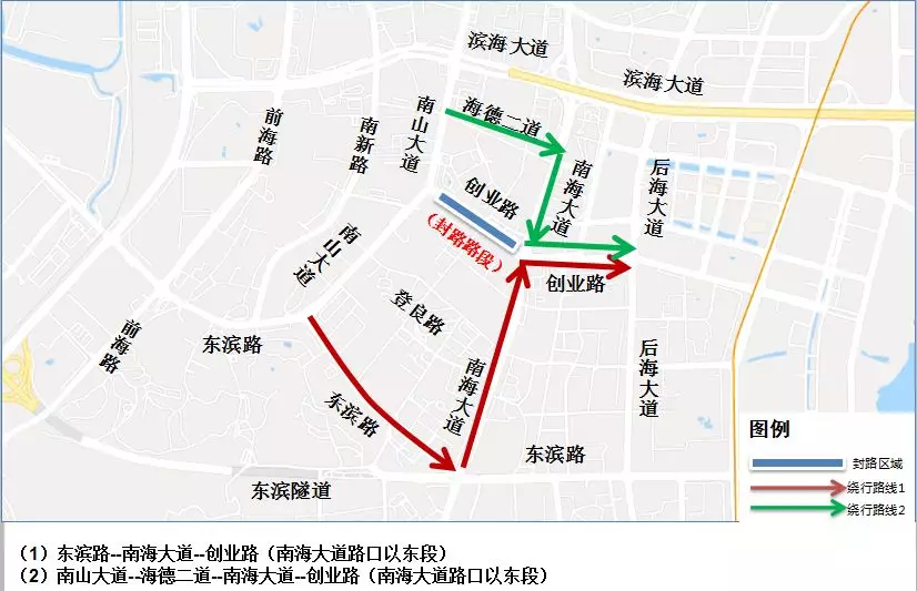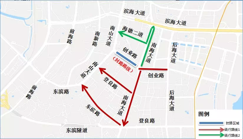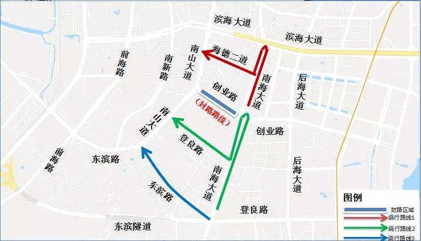 原經南海大道創(chuàng)業(yè)路口轉入創(chuàng)業(yè)路西行,前往南山大道的車輛,可按以下路線繞行