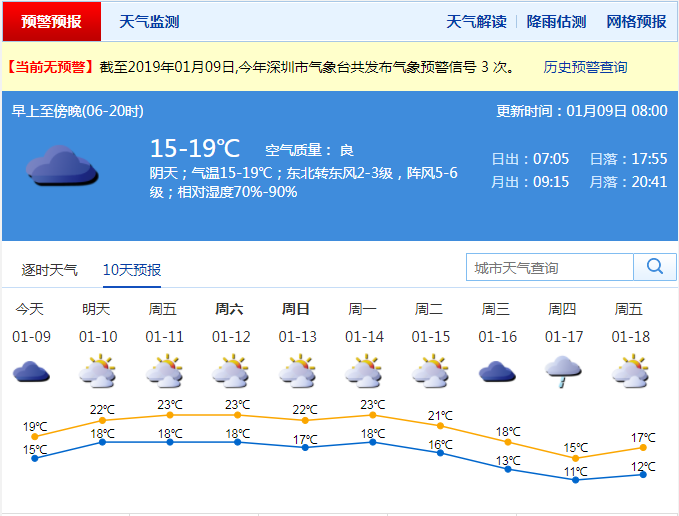 深圳新聞網(wǎng)2019年1月9日訊(記者 陳婕)先帶來兩個(gè)好消息,首先是本周末陰沉天氣好轉(zhuǎn),有明顯陽光,適宜出行游玩浪起來!第二個(gè)好消息就是春節(jié)期間(2月4日-2月10日),無強(qiáng)冷空氣影響深圳市。假期前期溫暖舒適,后期弱冷空氣影響,氣溫略降,最低氣溫12-13℃。目前大片云層覆蓋了我國(guó)華南地區(qū),深圳市天氣陰沉,缺少陽光,明后天還是持續(xù)陰天,有分散小雨,衣服曬不干。