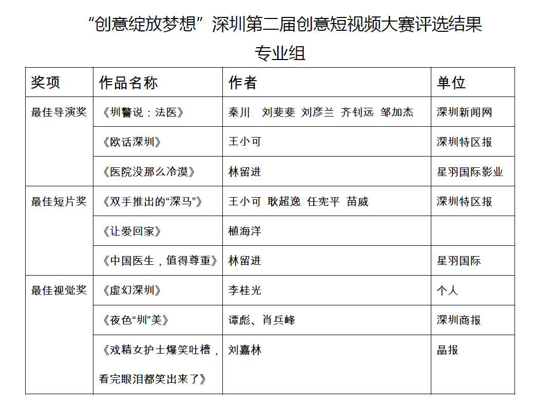 《深圳,一座不夜城》的作者汪國桓獲得大賽業(yè)余組的最佳視覺獎。他表示,自己是一位銀行職員,出于對深圳這座城市的熱愛,利用休息時(shí)間拍攝了這部展現(xiàn)深圳綺麗城市風(fēng)光的短片?!案兄x深圳第二屆創(chuàng)意短視頻大賽這個活動,讓我們這些身處不同工作崗位中但依舊非常熱愛著視頻拍攝制作的人能有一個完美的平臺展現(xiàn)自己?!彼嬖V記者。