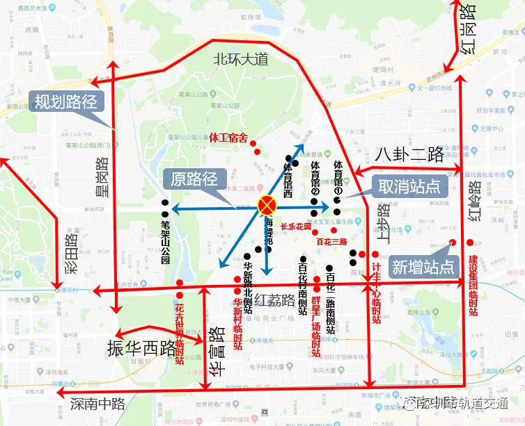 車行交通調(diào)整為:皇崗路 -紅荔路 -華富路 -華新路;上步路 -紅荔路 -華強北路 -華新路或上步路 -筍崗西路 -百花四路 -華新路。