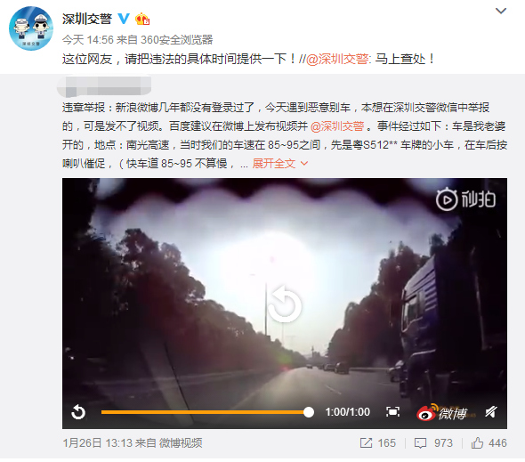 1月28日下午5點,深圳交警在微博上也給網(wǎng)友作出回復,對于長時間龜速占用超車道的行為也將一并調(diào)查。