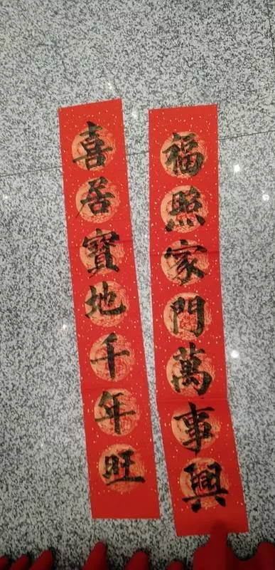 書法家寫下:喜居寶地千年旺,福照家門萬事興。
