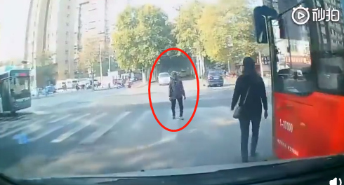 老太太走到小車正前方時(shí)卻突然停下腳步,緊接著緩緩臥倒在地。