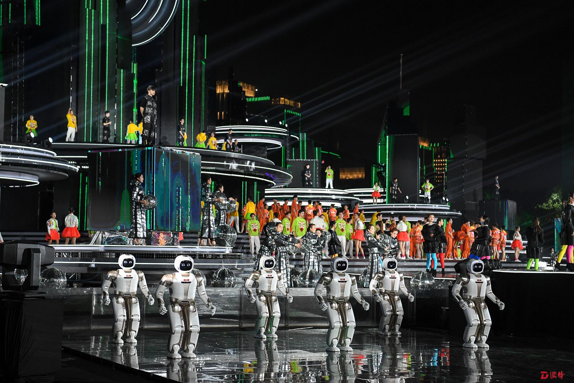 “可以說深圳分會(huì)場的每一個(gè)節(jié)目都貫穿了科技元素?!北热缥枧_(tái)上最新型的跳舞機(jī)器人、機(jī)械臂,演員衣服上嵌入的柔性屏,還有無人機(jī)、撲翼飛行器、云軌、云巴等等。晚會(huì)還使用了非常多的AR(增強(qiáng)現(xiàn)實(shí))技術(shù),在屏幕上把虛擬世界套在現(xiàn)實(shí)世界并進(jìn)行互動(dòng),虛實(shí)結(jié)合呈現(xiàn)出十足的“夢幻”之感。