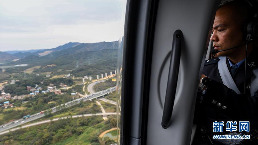 2月1日,深圳市公安局交通警察局指揮處民警劉松超在直升機上了解路面情況。2019年春運,深圳市公安局交通警察局開啟陸空立體探路模式,首次啟用直升機探路。據(jù)介紹,此次直升機探路將開展5次,屆時交警選取代表性線路從空中探察路面情況,及時為司機提供立體交通通行指引。新華社記者 毛思倩 攝