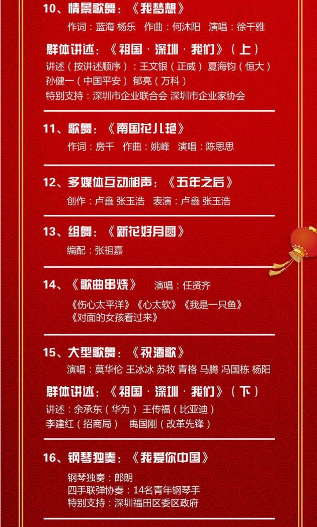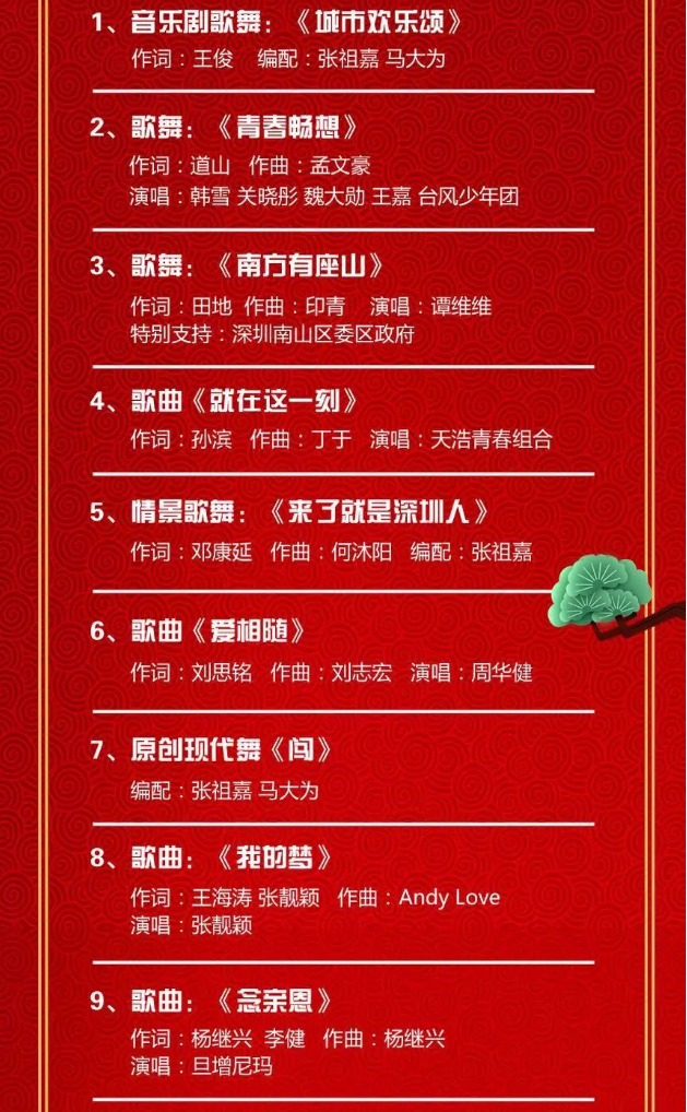 深圳春晚由央視主持人李思思、深圳衛(wèi)視主持人龐瑋、楚喬和香港著名主持人陳啟泰共同主持。晚會節(jié)目內(nèi)容豐富、表現(xiàn)形式多樣,有歌舞、歌曲、交響樂,還有多媒體互動相聲。演員陣容強大,邀請了張靚穎、廖昌永、郎朗、周華健、汪明荃、任賢齊、譚維維等多位明星參演,力爭為全國觀眾送上一道豐盛又精彩的年夜“大餐”。