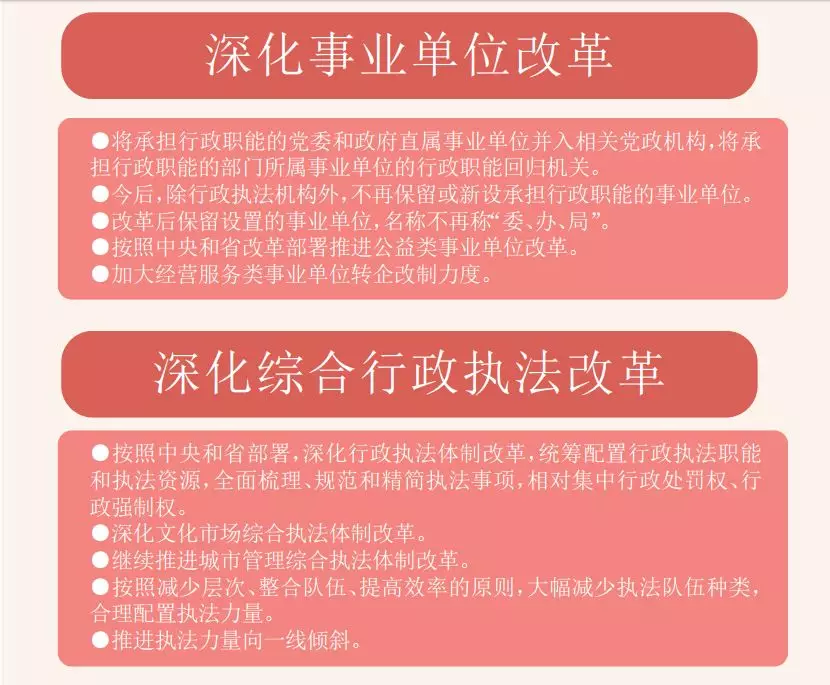 五是全面落實優(yōu)化協(xié)同高效原則。堅持一件事情原則上由一個部門負責,把理順職責放在重要位置,從有利于突出主業(yè)、有利于服務管理的角度出發(fā),實事求是,科學設置黨委和政府機構,宜大則大、宜小則小,該加強的加強、該精簡的精簡,實現(xiàn)機構的優(yōu)化整合,職責的深度融合。