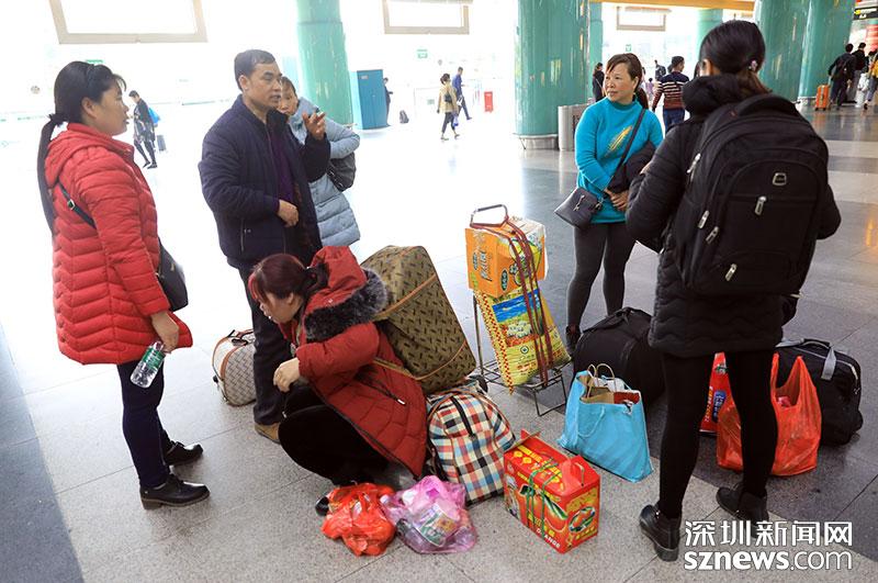 不少旅客攜帶當(dāng)?shù)厮约凹亦l(xiāng)特產(chǎn)返回深圳,圖中這一家人下車(chē)后整理行李