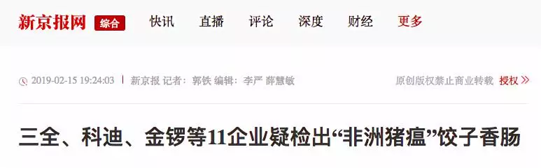 據(jù)紅星新聞報(bào)道,多家媒體稱,2月9日,湖南省湘西自治州重大動(dòng)物疫病防制指揮部辦公室接到省防治重大動(dòng)物疫病指揮部辦公室通知,要求瀘溪縣重大動(dòng)物疫病防制指揮部辦公室對(duì)來源于吉首市凌云冷凍食品批發(fā)部凍庫的產(chǎn)品進(jìn)行抽樣,在瀘溪縣好又多和萬家福兩家超市共抽取4個(gè)批次12份樣品,經(jīng)州動(dòng)物疫病預(yù)防控制中心檢測(cè),其中由河南三全食品有限公司生產(chǎn)批次為20190113H的“三全灌湯水餃”3份樣品為非洲豬瘟病毒核酸陽性。