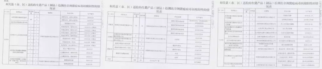 除速凍食品外,該網(wǎng)友發(fā)帖顯示,標(biāo)稱河南省長隆食品有限責(zé)任公司、濟(jì)南康利斯食品有限公司、山東齊匯食品有限公司、山東臨沂金鑼文瑞食品有限公司、河南惠萬家食品有限公司、合肥市凱樂斯食品有限公司生產(chǎn)的培根、香腸、火腿腸等個(gè)別批次產(chǎn)品樣品,也被檢出非洲豬瘟病毒核酸陽性。