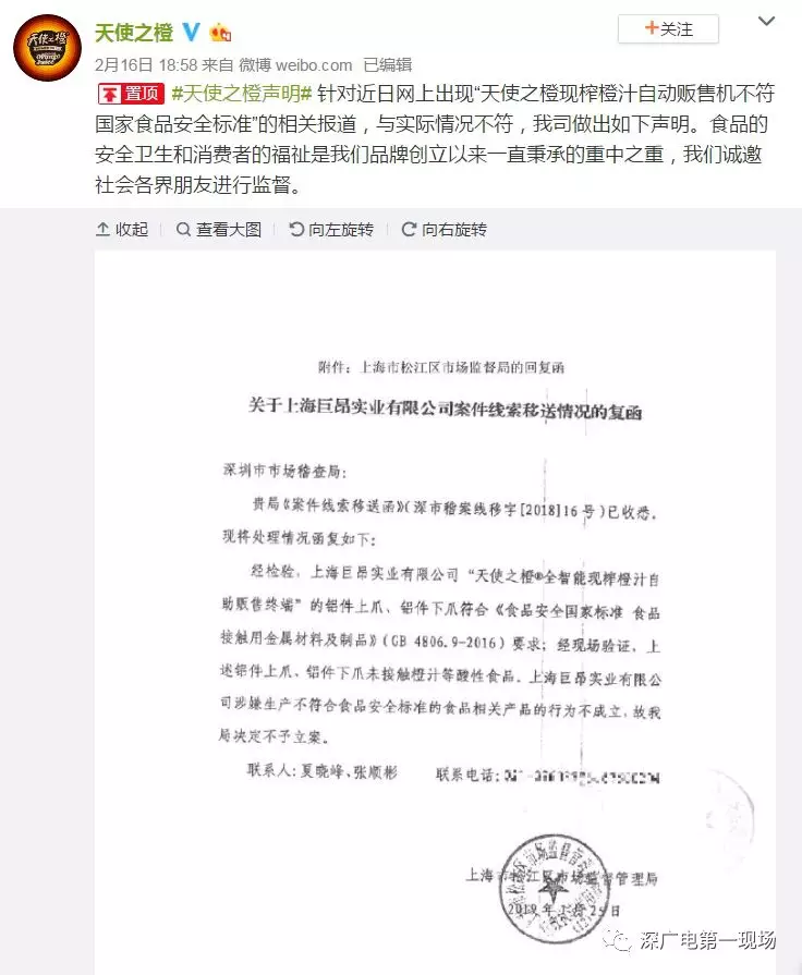 2月16日,“天使之橙”官方發(fā)表聲明,稱上海市松江區(qū)市場(chǎng)監(jiān)管局經(jīng)過現(xiàn)場(chǎng)檢查,并送第三方檢測(cè)機(jī)構(gòu)檢測(cè),認(rèn)為“上下爪”并不會(huì)接觸橙汁等酸性食品,巨昂方面涉嫌違反《食品安全法》的相關(guān)行為不成立,該局不予立案。