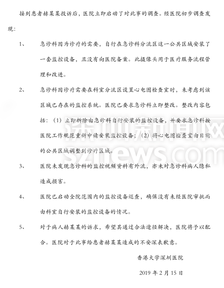 近日,赫女士在港大深圳醫(yī)院掀衣做心電圖檢查時(shí)發(fā)現(xiàn),有個(gè)攝像頭對著她,赫女士要求查看錄像未果遂報(bào)警處理。