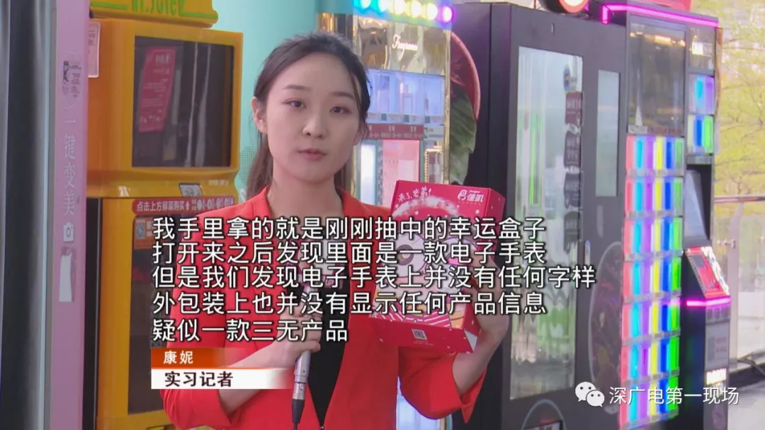 記者注意到,這家商場里擺放的除了口紅機(jī)外,還有所謂的“幸運禮盒”機(jī),這個機(jī)器外型與自動售貨機(jī)相似,游戲規(guī)則更加簡單粗暴,只要掃碼付款三十元,就能得到一個幸運禮盒。但禮盒里的獎品卻讓記者大跌眼鏡。