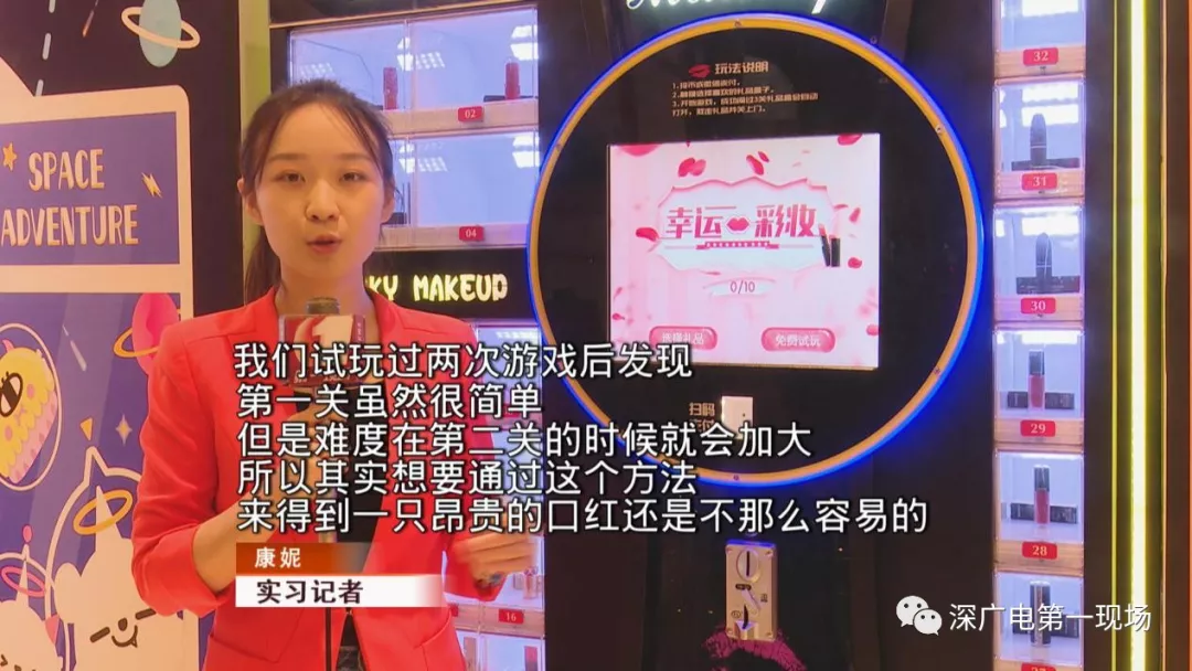 在福田區(qū)的一家商場的醒目位置,擺放著幾臺口紅機(jī),機(jī)器上有幾十個透明的小格子,里面都擺放著大牌口紅。但想要得到口紅,就得先玩游戲,游戲一共有三關(guān)。依托于一個糖果轉(zhuǎn)盤,每關(guān)糖果旋轉(zhuǎn)的速度都會提高一些,只有全部通關(guān)之后,才能拿到心儀的口紅。