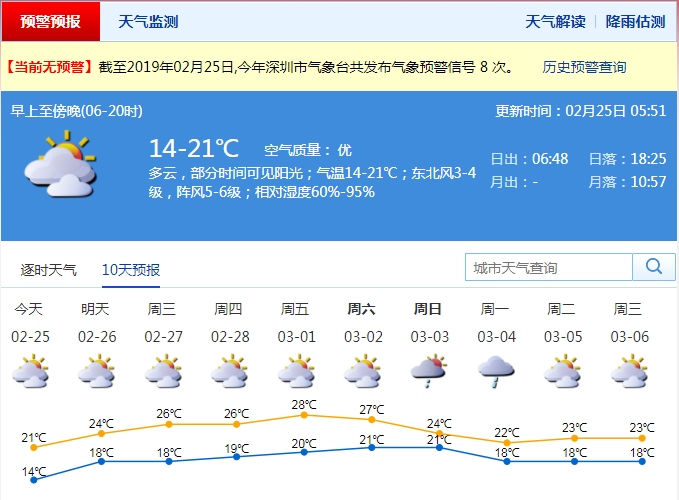 深圳新聞網(wǎng)2019年2月25日訊 記者從深圳市氣象局了解到,24日降雨結(jié)束,天色趨于明朗,白天最高氣溫18℃左右。預(yù)計25日起多云可見陽光,氣溫逐日回升,有輕霧或霾,轉(zhuǎn)溫暖濕潤天氣。展望3月我市天氣偏暖,空氣潮濕,雨霧等低能見度天氣易發(fā)。3月仍有3-4次弱冷空氣影響,強度比本次冷空氣弱,但冷空氣活動時氣溫都會比前日略降,并轉(zhuǎn)陰雨天氣。
