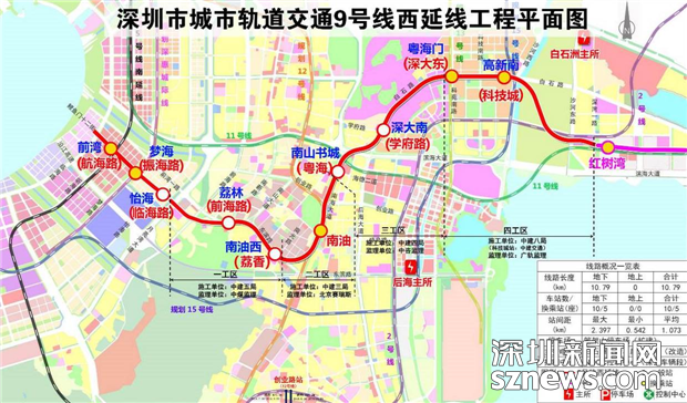 據了解,地鐵9號線西延線東起紅樹灣南站,經深圳灣至前海灣,終點為前灣站,與5號線南延線換乘。線路全長約10.8千米,設車站10座,全線采用地下敷設方式。