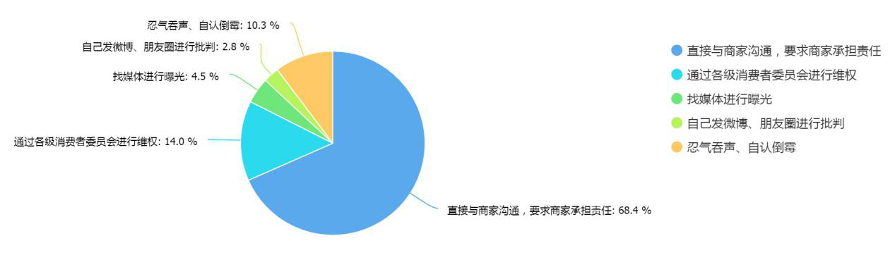 有68.4%的受訪者在遇到消費侵權(quán)后選擇直接與商家溝通,要求商家承擔(dān)責(zé)任,10.4%的受訪者會選擇忍氣吞聲、自認(rèn)倒霉;其中男性消費者更傾向于找媒體曝光,而女性消費者則傾向于忍氣吞聲。