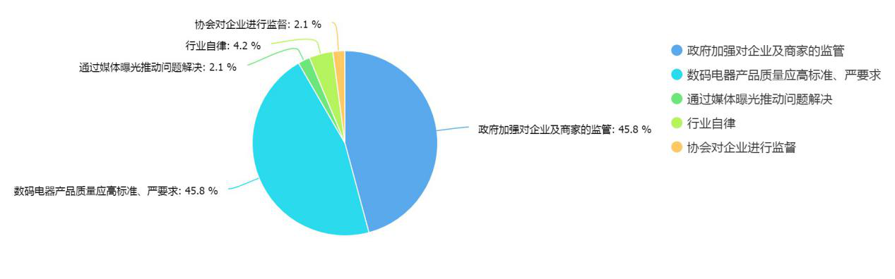 針對目前數(shù)碼家電行業(yè)中存在的相關(guān)問題,有45.8%的消費者建議通過政府加強(qiáng)對企業(yè)及商家的監(jiān)管,另有部分網(wǎng)民建議數(shù)碼家電類產(chǎn)品應(yīng)該設(shè)立更高的的標(biāo)準(zhǔn),對企業(yè)應(yīng)該提出更高的要求。