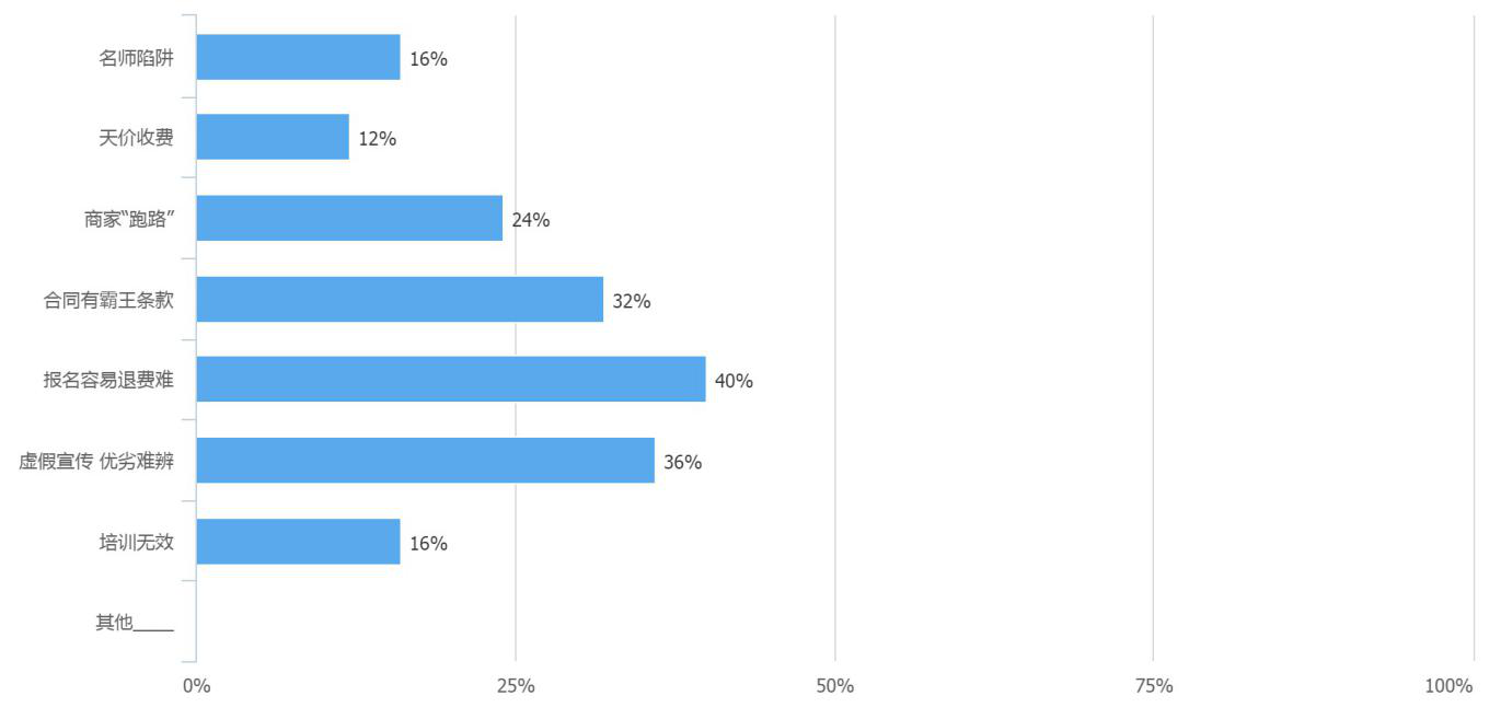 在早教培優(yōu)、少兒英語、課外輔導(dǎo)、職業(yè)培訓(xùn)等多個領(lǐng)域的教育消費中,課外輔導(dǎo)占比40%成為最讓消費者頭疼的消費陷阱,同時,“報名容易退費難”和“虛假宣傳優(yōu)劣難辨”成為消費者的主要困擾。在選擇教育培訓(xùn)機(jī)構(gòu)時,72%的消費者最關(guān)注該機(jī)構(gòu)的師資質(zhì)量,并認(rèn)為花費在各種教育機(jī)構(gòu)上的資金并不能“物有所用”。遇到消費欺詐時,消費者最先采取的措施是“找相關(guān)培訓(xùn)機(jī)構(gòu)解決問題”。