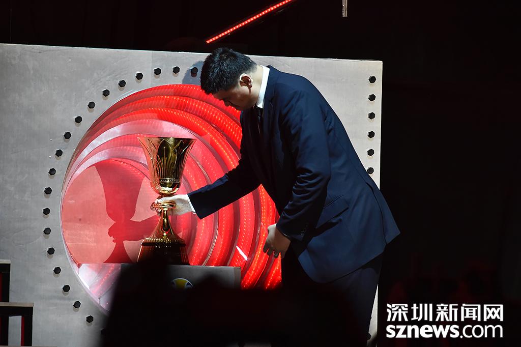 姚明將獎(jiǎng)杯放入固定位置中
