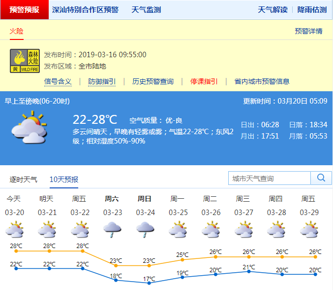 深圳新聞網(wǎng)2019年3月20日訊 深圳市氣象局預計20日多云間晴天,早晚有輕霧或霧;21-28℃;東風2級;濕度50%-90%。21日云量增多,偶有分散陣雨;22-23日多云轉雷陣雨,可能伴有7-8級短時大風,氣溫下降;24-25日間中有短時陣雨;26日起轉多云。