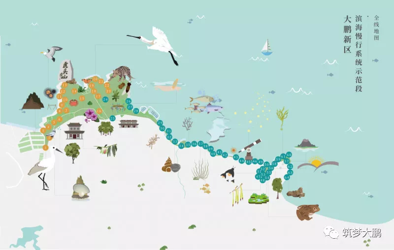 大鵬新區(qū)根據線路的地形、山海景觀、人文景觀的分布,確定了“打造‘兩線、三段、五大節(jié)點’的濱海生態(tài)自然課堂步道”。據新區(qū)建筑工務局負責人介紹,從新大河入??诘酱髞啚澈0堵咕讘已?,全長18.7公里的海岸線上分布著河流、山林、海灘、溪流、濕地等多樣生態(tài)系統。2017年7月,大鵬新區(qū)按照濱海慢行系統示范工程標準,動工建設新大-鹿嘴市政綠道?!皟删€”指的是沿著海岸的濱海徒步路線和城市二號綠道線,兩條線之間的6.6平方公里土地將形成一座開放的郊野公園;“三段”分別為活力生活段、自然生態(tài)段和休閑旅游段;“五大節(jié)點”為山海綠畔、古廟遺風、東山凹、愛情灘、鹿咀山莊等自然景觀。