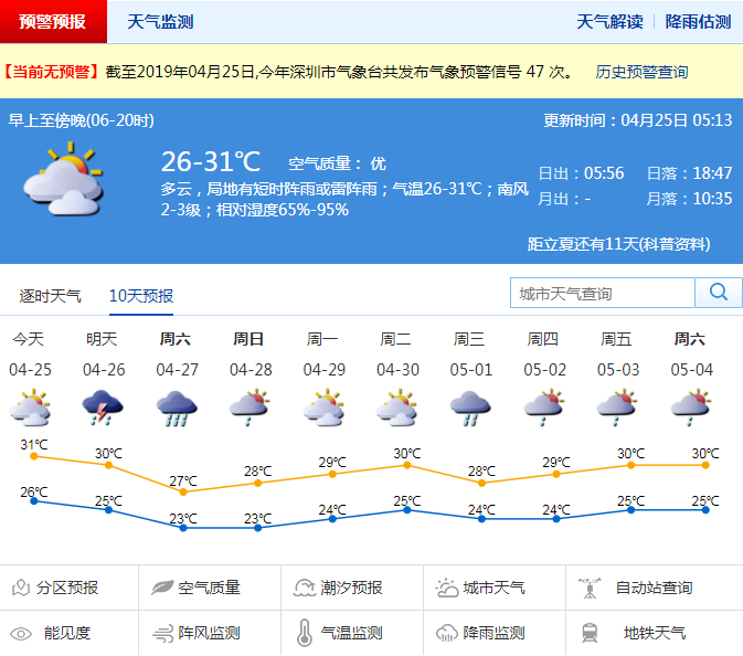 深圳新聞網(wǎng)2019年4月25日訊 本周以來,陽光充足,氣溫逐日上升,不過隨著“五一”假期的臨近,強(qiáng)降雨也在悄悄靠近。據(jù)市氣象臺預(yù)測,25日我市多云,中午前后炎熱,有短時陣雨或雷陣雨,早晚東部有大霧。26-27日有大雨到暴雨,伴短時強(qiáng)降水、8級左右短時大風(fēng)和雷暴。28-30日降雨減弱,有陣雨或雷陣雨;展望“五一”假期前期還有一次強(qiáng)降雨過程。