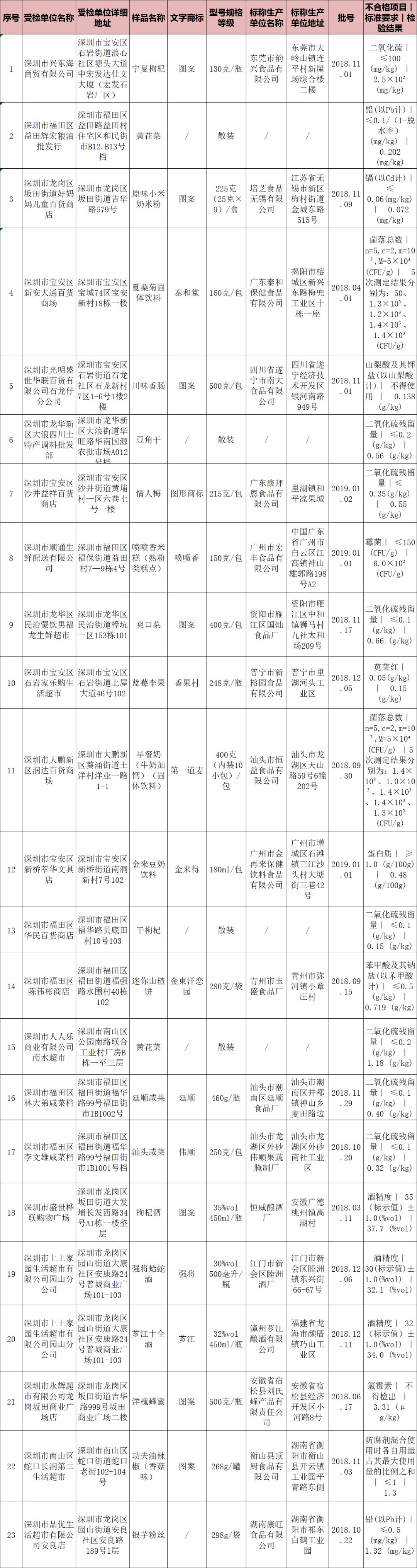 本次共抽檢流通環(huán)節(jié)食品2131批次,涉及流通環(huán)節(jié)經(jīng)營主體529家次,共檢測食品指標13373項次。其中檢出不合格樣品23批次,涉及不合格食品類別有茶葉及相關制品1批次,淀粉及淀粉制品1批次,蜂產(chǎn)品1批次,糕點1批次,酒類3批次,肉制品1批次,蔬菜制品6批次,水果制品4批次,特殊膳食食品1批次,調味品1批次,飲料3批次;涉及不合格項目類別為獸藥殘留、金屬等元素污染、微生物污染、食品添加劑、品質指標。