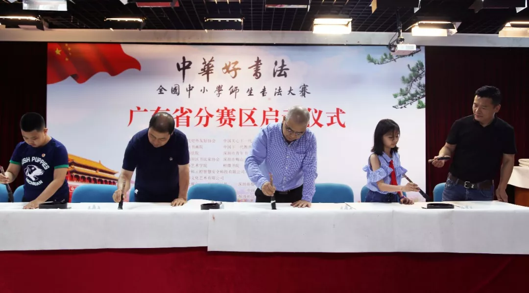 “中華好書法”全國中小學師生書法大賽廣東賽區(qū)組委會執(zhí)行副主任趙永金和教師代表趙軍、崔占海,學生代表劉子文、李唐心上臺開筆