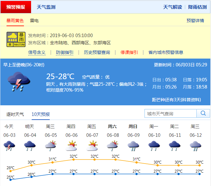 深圳市氣象臺(tái)于2019年06月03日05時(shí)10分在全市發(fā)布暴雨黃色預(yù)警,全市進(jìn)入暴雨戒備狀態(tài),請(qǐng)學(xué)生和家長(zhǎng)做好防雨防雷措施,雨急時(shí)就近避雨,上學(xué)途中注意交通安全。