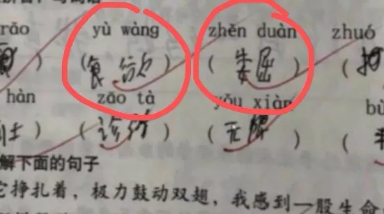 可是仔細(xì)一瞧,卻發(fā)現(xiàn)了蹊蹺。明明題目是讀拼音,寫詞語,可是孩子寫的詞語和上面的拼音,完全對不上號,老師卻依舊打了對勾。