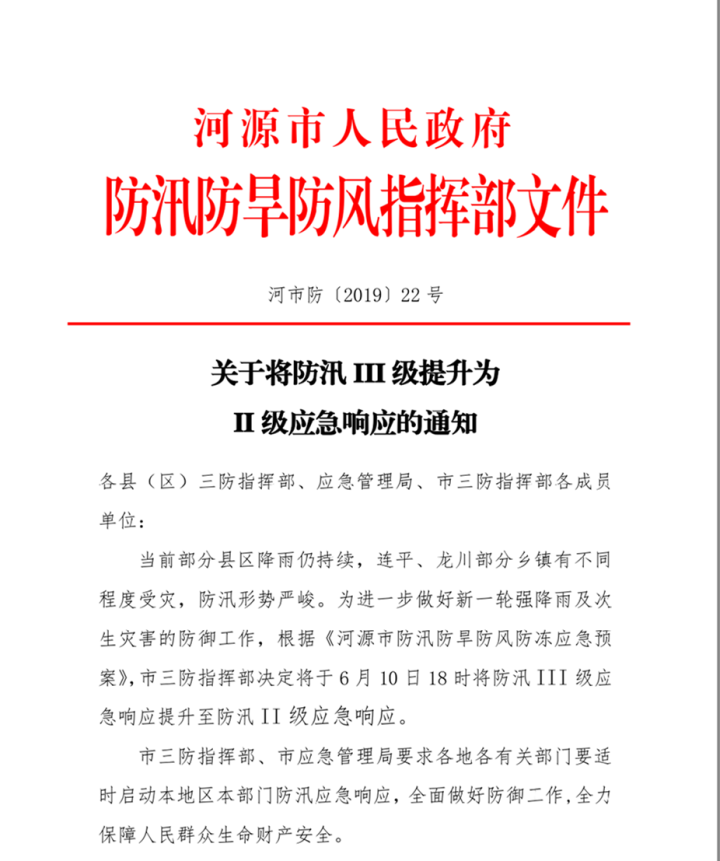 當前部分縣區(qū)降雨仍持續(xù),連平、龍川部分鄉(xiāng)鎮(zhèn)有不同程度受災,防汛形勢嚴峻。為進一步做好新一輪強降雨及次生災害的防御工作,根據《河源市防汛防旱防風防凍應急預案》,市三防指揮部決定將于6月10日18時將防汛III級應急響應提升至防汛II級應急響應。