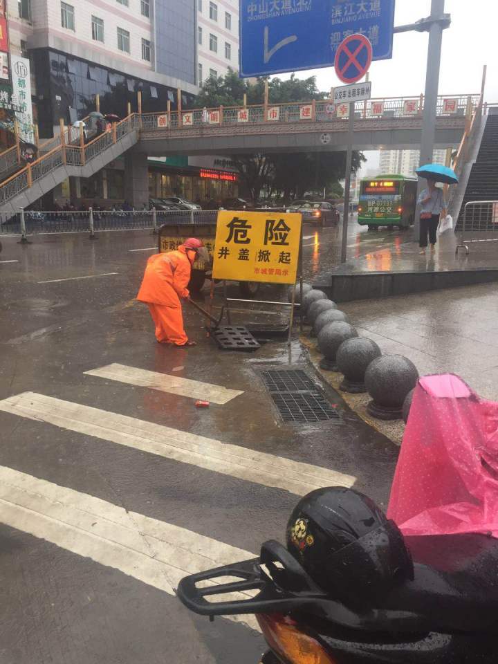 市城管部門(mén)已加派工作人員,加班加點(diǎn),打開(kāi)華怡路口等易澇點(diǎn)井蓋并設(shè)置警示牌,加大對(duì)市區(qū)排水的力度。