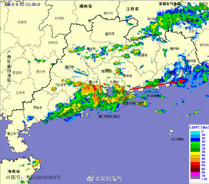 預(yù)計全市1-2小時內(nèi)將出現(xiàn)20-40毫米局部50毫米降水,深圳市氣象臺于2019年06月13日08時將暴雨黃色預(yù)警擴(kuò)展至全市,全市處于暴雨戒備狀態(tài),請注意防范。