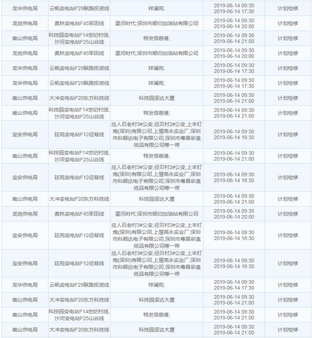 南方電網(wǎng)發(fā)布6月13日至6月16日深圳停電計劃 涉及多個區(qū)