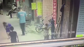 可能是出于好奇心,身旁無人看管的他,抱住了店鋪門口佇立的一個氧氣瓶,并嘗試拉動。