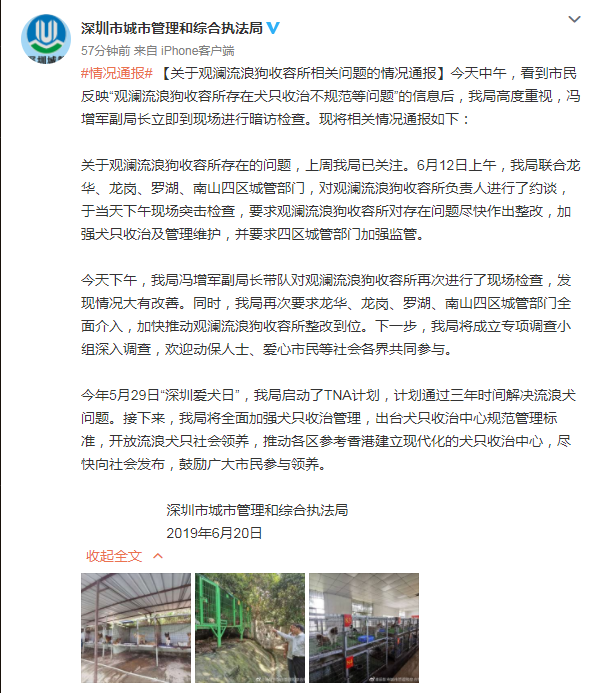 今天下午,我局馮增軍副局長帶隊對觀瀾流浪狗收容所再次進行了現(xiàn)場檢查,發(fā)現(xiàn)情況大有改善。同時,我局再次要求龍華、龍崗、羅湖、南山四區(qū)城管部門全面介入,加快推動觀瀾流浪狗收容所整改到位。下一步,我局將成立專項調(diào)查小組深入調(diào)查,歡迎動保人士、愛心市民等社會各界共同參與。