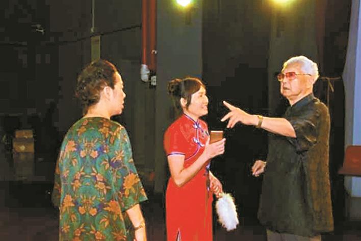 2019年4月,譚嗣英(右一)在2018~2019年深圳中老年藝術(shù)團(tuán)隊(duì)年度優(yōu)秀節(jié)目展演《祖國頌》系列節(jié)目彩排時(shí)現(xiàn)場指導(dǎo)。