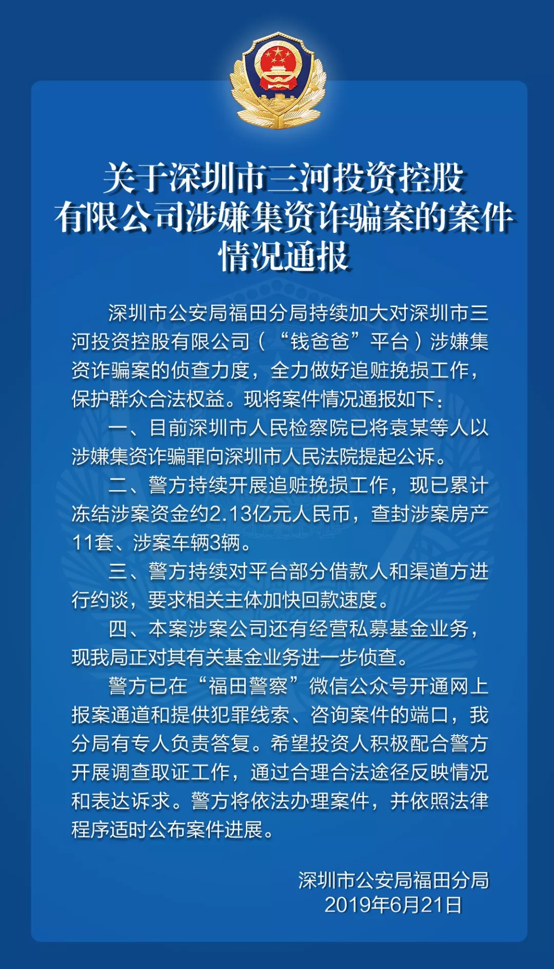 關(guān)于深圳市三河投資控股有限公司涉嫌集資詐騙案的案件情況通報