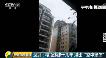 深圳福田區(qū)一個(gè)小區(qū)的居民日前爆料稱,小區(qū)一位業(yè)主違規(guī)在天臺(tái)上加建了幾層樓,遠(yuǎn)遠(yuǎn)看去就像一個(gè)“空中堡壘”,曾經(jīng)有人差點(diǎn)被上面掉落的鋼筋砸中,如此醒目的違建,已經(jīng)存在了十幾年。