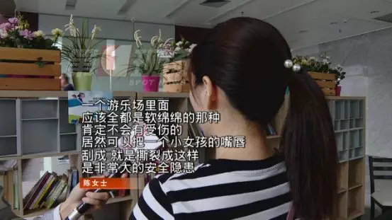 陳女士說,這個臺階原本是用一層軟軟的泡沫包裹,并用鎖扣固定的。這個鎖扣原本也應(yīng)該要包裹起來,但不知為何卻裸露在外。陳女士的女兒這么一摔,正好磕在硬硬的鎖扣上,嘴巴被劃了一個口子。